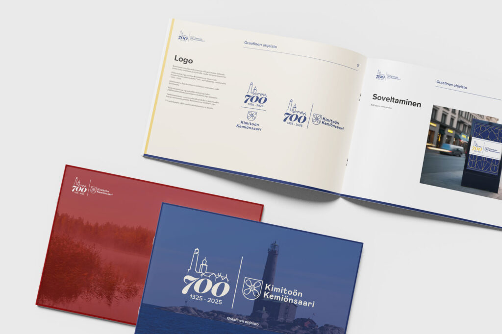 Juhlavuoden visuaalinen ilme, logosuunnittelu, kunnallislehden taitto ja festivaalimateriaalit