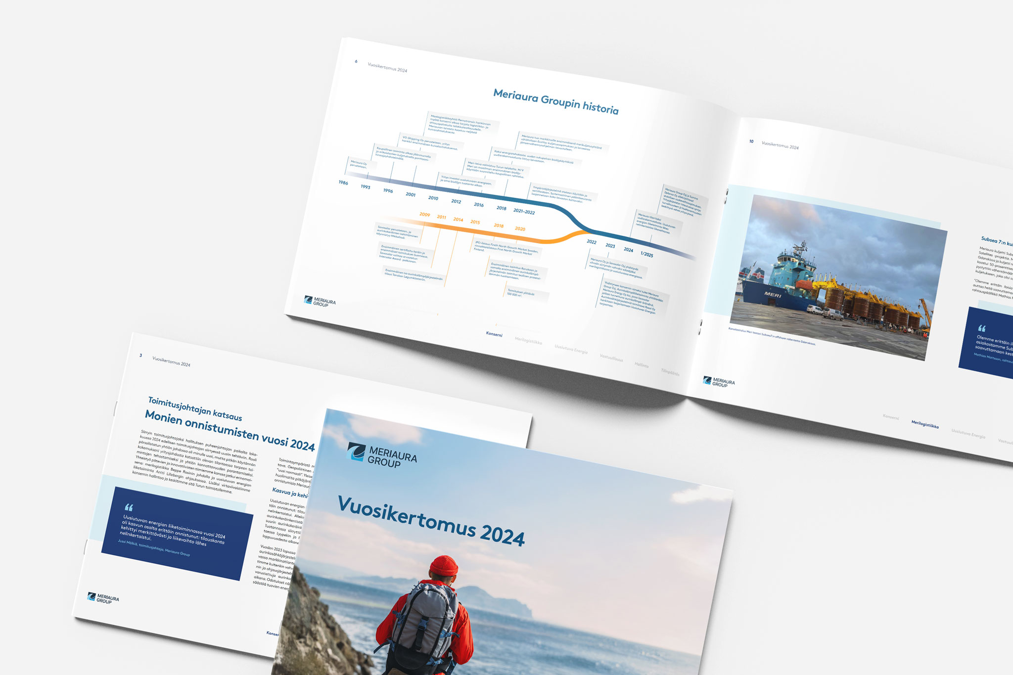 Vuosikertomukset on toteutettu johdonmukaisesti Meriauran graafisen ohjeiston mukaisesti, jotta vuosikertomus tukee brändiä ja visuaalista identiteettiä.