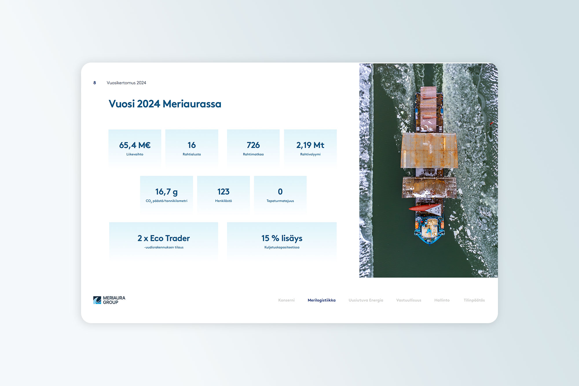Meriauran vuosikertomus on selkeä, visuaalisesti harmoninen ja teknisesti viimeistelty raportti, joka palvelee sijoittajia ja sidosryhmiä, mediaa sekä Meriauran henkilöstöä.